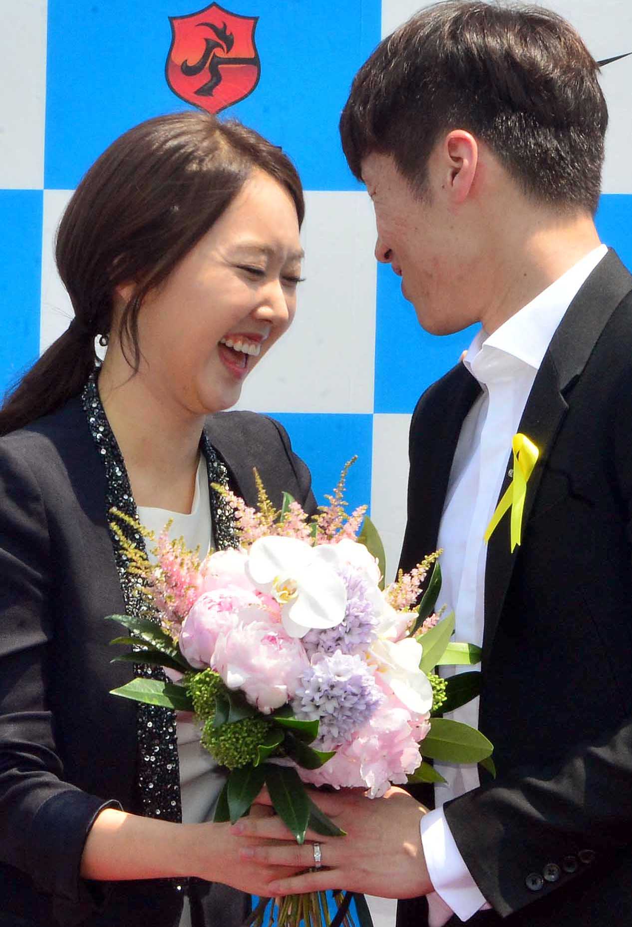 | ▲ 박지성(33·PSV에인트호벤)이 14일 오전 경기 수원시 박지성축구센터에서 현역 은퇴 및 향후 거취 관련 기자회견을 연 가운데 그의 여자친구인 김민지 전 아나운서가 깜짝 방문, 꽃다발을 전달하고 있다./뉴시스 | ||