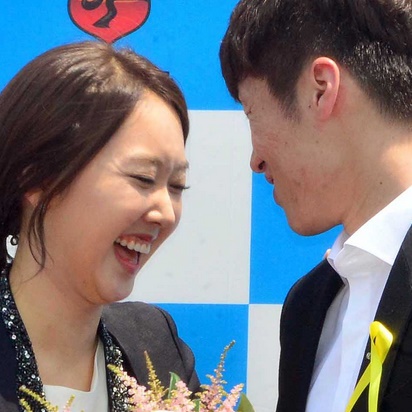 | ▲ 박지성(33·PSV에인트호벤)이 14일 오전 경기 수원시 박지성축구센터에서 현역 은퇴 및 향후 거취 관련 기자회견을 연 가운데 그의 여자친구인 김민지 전 아나운서가 깜짝 방문, 꽃다발을 전달하고 있다./뉴시스 | ||