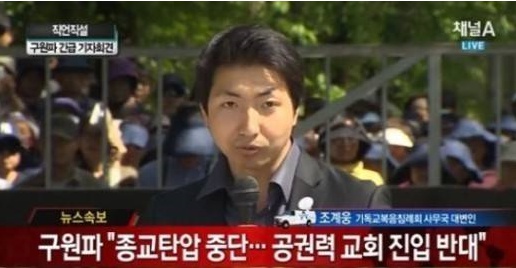 | ▲ 구원파 신도 300여명은 15일 기자회견을 갖고 "세월호 승객 사망 책임은 해경에 있다"고 주장했다./사진=채널A 방송 캡처 | ||