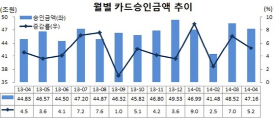 경기회복에 대한 소비심리 개선으로 카드승인금액이 큰폭으로 늘어날 것으로 기대됐으나 4월 16일 세월호 참사 여파로 4월 마지막 주 황금연휴가 시작됐음에도 작년 4월 4.5%에 비해 승인금액 증가세가 큰 폭으로 상승하지 못했다.