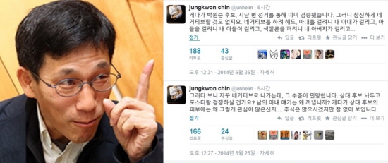 진중권 교수는 26일 자신의 트위터에 “자꾸 네거티브로 나가는데 그 수준이 민망하다. 상대 후보 놔두고 포스터랑 경쟁하실 건가? 남의 아내 얘기는 왜 꺼내나? 게다가 상대 후보의 피부에는 왜 그렇게 관심이 많으신지. 주식은 많으시겠지만 참 없어 보인다”는 글을 게재했다.