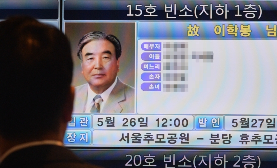 입술을 굳게 다문 이학봉 전 처장의 영정사진 우측에는 전두환 전 대통령이 보낸 근조 화환이 자리 잡고 있었다. 로비에서도 한눈에 보이는 곳이었다.