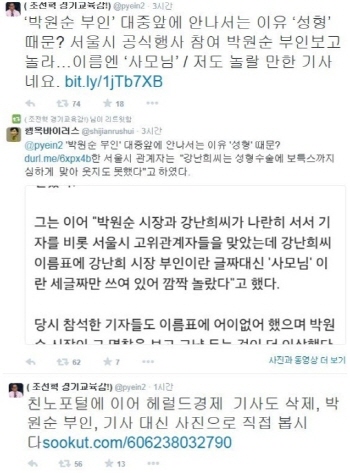 변희재 대표는 26일 자신의 트위터를 통해 "′박원순 부인’ 대중 앞에 안 나서는 이유 ‘성형’ 때문? 서울시 공식행사 참여 박원순 부인 보고 놀라…이름엔 ‘사모님’/ 저도 놀랄 만한 기사네요"라는 글과 함께 기사를 링크했다.