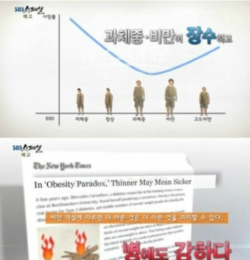 SBS 스페셜은 지난 25일 '비만의 역설-'뚱뚱한 사람이 오래 산다’ 편을 방송했다. 비만이 만병의 근원이 아니며 오히려 마른 체형보다 장수할 수 있다는 것으로, 흔히 알고 있는 '비만은 위험하다'는 상식과 달라 시청자들의 관심을 끌었다.