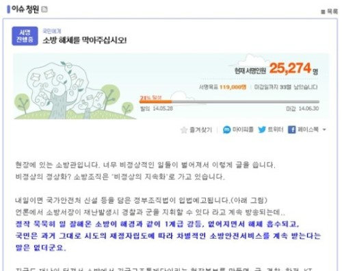 | ▲ 소방방재청 해체 반대 청원글/포털사이트 다음 캡처 | ||