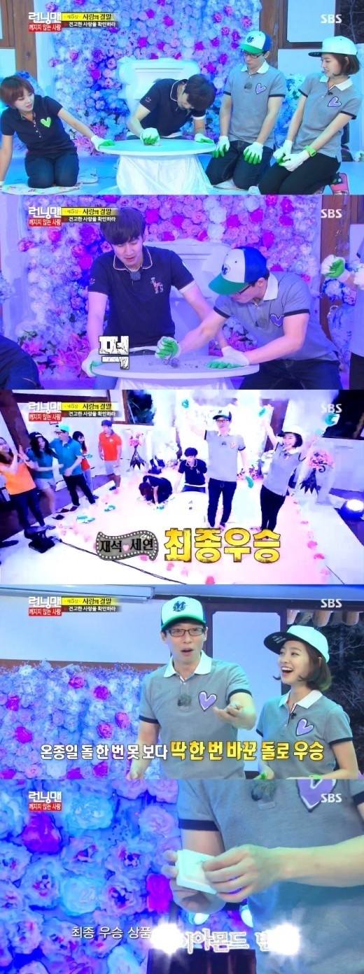 1일 방송된 SBS ‘일요일이 좋다-런닝맨’에서는 ‘깨지지 않는 사랑’ 특집으로 가장 강한 돌을 손에 쥔 커플이 우승하는 게임이 진행됐다.