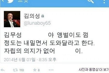 김의성은 지난 1일 트위터에 "김무성 거지 XX야, 앵벌이도 껌 정도는 내밀면서 도와달라고 한다. 자립의 의지가 없어 XXX이"라는 욕설을 해 논란을 일으켰다.