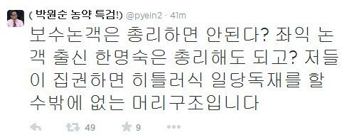 변희재 대표는 10일 자신의 트위터에 “보수논객은 총리하면 안 된다? 좌익 논객 출신 한명숙은 총리해도 되고?”라며 "저들이 집권하면 히틀러식 일당독재를 할 수밖에 없는 머리구조다”라고 강하게 비난했다.