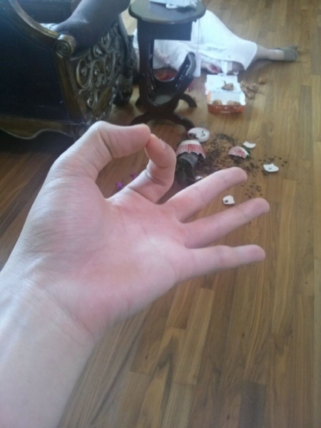 사진 속에는 여성으로 추정되는 사람이 목욕 가운을 입은 채 쓰러져 있고 그 옆에는 깨진 화분이 놓여있다.