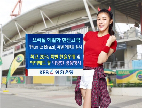 외환은행은 다음달 18일까지 영업점 창구에서 1000헤알 이상 환전하면 기본 환율우대 혜택 15%, 업무출장 고객인 경우 최고 5% 환율 우대 혜택이 추가로 제공된다고 16일 밝혔다.