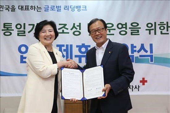 우리은행은 17일 대한적십자사와 통일기금 조성 및 운영을 위한 업무협약을 맺고 '우리겨레 통일 패키지'를 판매한다고 밝혔다.