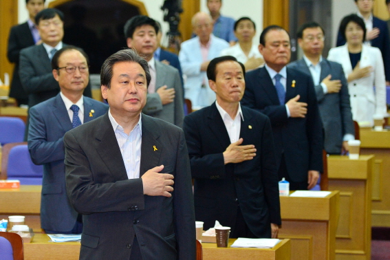 | ▲ 새누리당 대표 경선에 나선 김무성의원이 17일 국회에서 열린 새누리당 통일경제교실에서 국민의례를 하고 있다. | ||