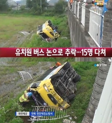 유치원 버스 추락 사고, 3m 아래 논바닥으로 처박혀...원생 등 15명 부상