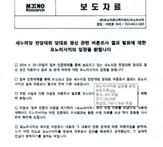 당대표 적합도 지지율을 조사한 것으로 알려진 여론조사전문기관 모노리서치는 21일 오후 "언론에 발표된 조사내용과 결과는 자신들이 조사한 것과 완전히 다르며, 언론에도 배포하지 않았다"고 부인했다. 이어 조작논란이 불거진 후 수정된 보고서도 자신들과는 무관하다고 해명했다.