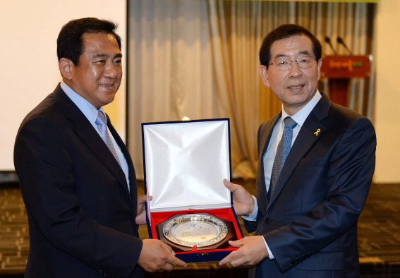 | ▲ 박원순 서울시장이 재선에 성공하면서 여야 차기대권주자 여론지지율에서 선두를 굳혀가고 있다. 리얼미터가 30일 발표한 여론조사에 따르면 박시장은 18%대로 1위를 차지했다. 문재인 새정치연합 의원이 2위, 정몽준 전 새누리당의원이3위를 기록했다. 박원순시장(오른쪽)이 이날 서울시의회를 방문해 양준욱 새정치연 대표의원에게 감사패를 전달하고 있다. | ||