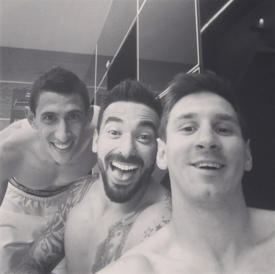 사진 속 메시는 에세키엘 라베시(29,파리생제르망), 앙헬 디 마리아(26,레알 마드리드)와 밝게 웃고 있다.