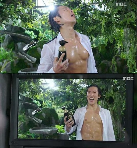 머리카락을 물에 적시고 셔츠를 풀어헤쳤다. 과장된 표정과 목소리로 연기해 눈길을 끌었다.