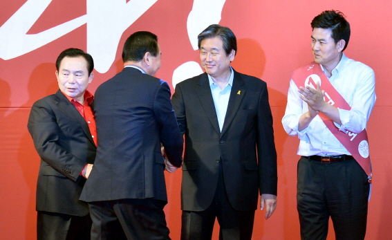 | ▲ 김무성의원 켐프는 6일 다른 당대표 후보들이 지지자들이 임시천막 설치, 플래카드 부착, 피켓과 명함나눠주기, 꽹과리와 북치기 등 구태의연한 선거행태를 보이고 있다면서 당선관위의 규칙에 어긋나는 불공정선거를 지양하자고 촉구했다. 6일 대전무역저신관에서 열린 충청 대전 호남 합동연설회에서 이인제 서청원(등을 보이는 사람), 김무성 김태호 후보들이 악수하고 있다.(왼쪽부터) | ||