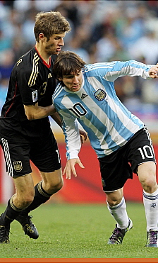 | ▲ 지난 2010 남아공월드컵 8강전에서 공을 다투고 있는 독일의 토마스 뮐러(왼쪽)와 아르헨티나의 리오넬 메시(오른쪽). 당시 독일은 아르헨티나를 4-0으로 대파했다. / 뉴시스 | ||