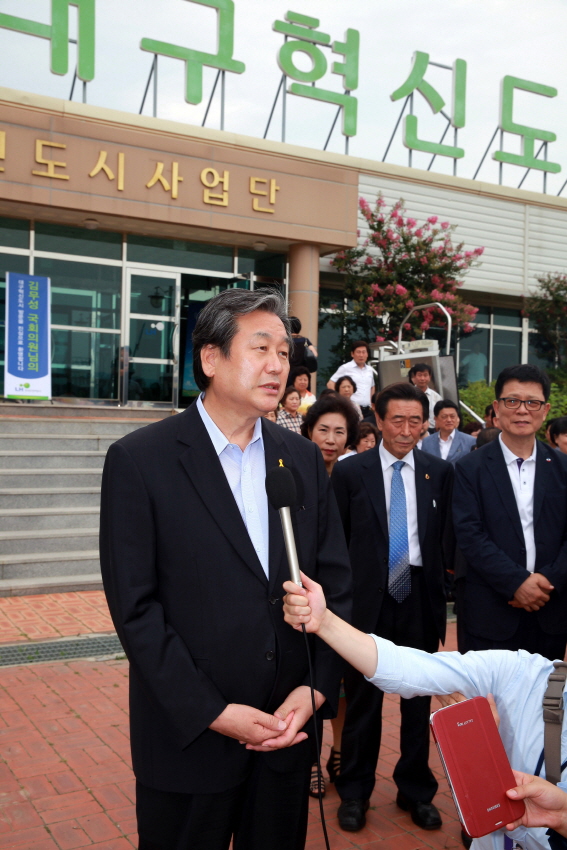 | ▲ 대구 혁신도시를 방문한 김무성후보가 12일 기자간담회에서 혁신도시 조성원가를 낮추기위해 주변인프라 건설비용을 국비로 지원하겠다고 약속했다. | ||