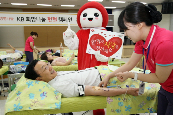 'KB 희망나눔 헌혈 캠페인'은 오는 19일까지 실시되며 본점 직원들은 4곳(여의도, 명동, 서여의도, 세우회)의 본점 대강당 및 헌혈 버스에서 헌혈을 실시하고 영업점 직원들은 전국 136개의 헌혈의 집에서 평일 저녁 및 주말을 이용하여 헌혈 캠페인에 동참하게 된다.