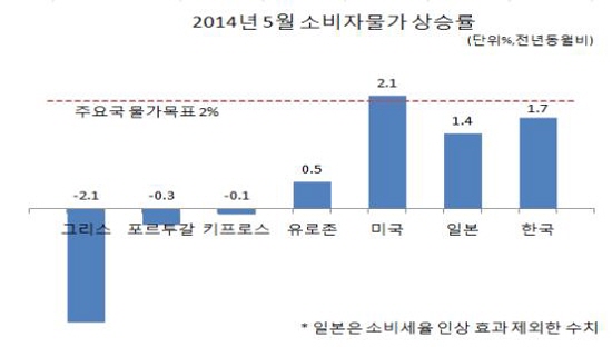 | ▲ 주요국가별 2014년 5월 소비자물가 상승률/하나금융연구소 제공 | ||