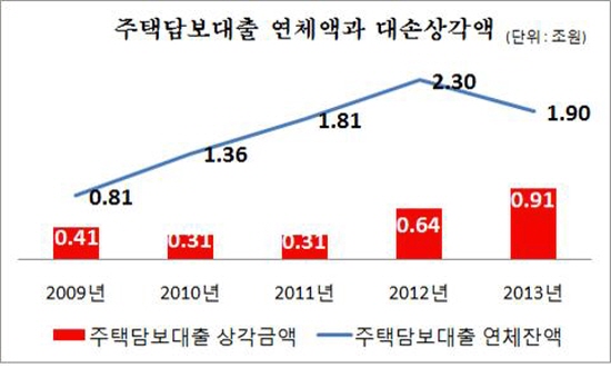 주택담보대출 대손상각액은 2011년 3051억원에서 2012년 6434억원, 2013년 9098억원으로 껑충 뛰었다. [미디어펜=장영일 기자]