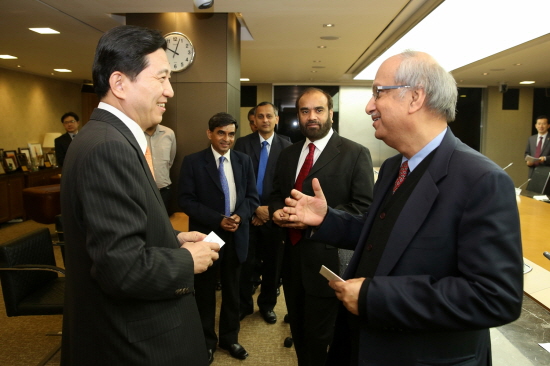 | ▲ 임영록 KB금융그룹 회장이 최근 서울 명동 본점에서 인도 마힌드라파이낸스의 바랏도시 회장을 접견했다./KB금융 제공 | ||