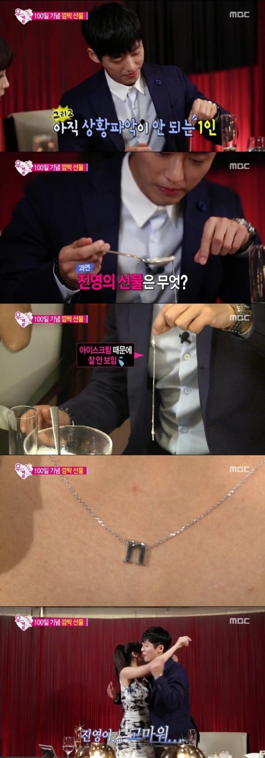 남궁민은 아이스크림을 먹다 목걸이가 나오자 깜짝 놀랐다.홍진영은 남궁민의 성 이니셜을 딴 알파벳 ‘N’을 문양으로 한 18K 목걸이를 선물했다.