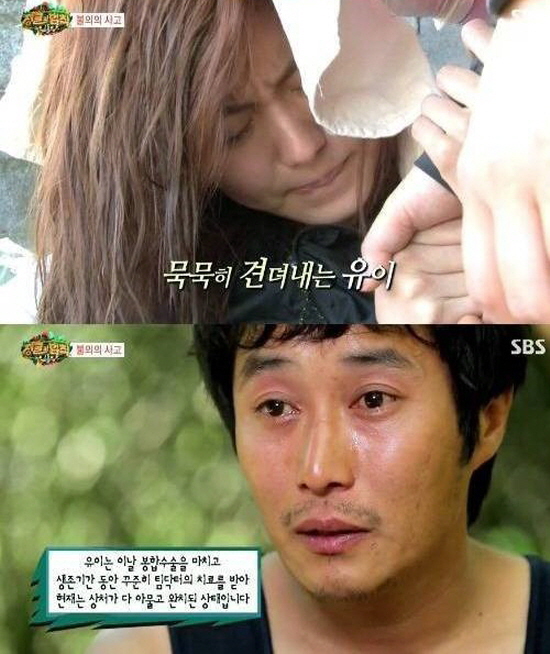 18일 방송된 SBS ‘정글의 법칙 in 인도양’에서 절벽에 서있던 병만족은 거센 파도를 맞는 중 유이가 바위로 떨어져 머리 밑과 어깨가 찢어지는 부상을 당했다.