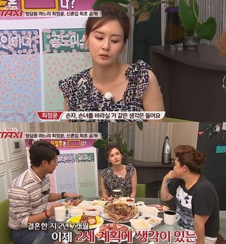 이날 방송에서 MC이영자가 “현재 남편과 시댁, 자신의 고민은 무엇이냐”고 묻자 최정윤은 “(시부모님이) 내색은 안 하시지만 손주, 손녀를 바라실 것”이라고 말했다.