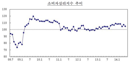 앞서 CCSI는 지난 1월(109) 경기 개선에 대한 기대감이 높아지며 2년11개월만에 최대치를 기록한 후 108을 유지했지만 지난 5월 세월호 참사로 인해 3포인트나 떨어졌다. 6월에는 2포인트 올랐으나 한 달만에 다시 하락세로 돌아섰다.