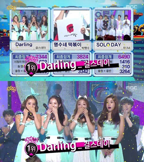 26일 오후 방송된 MBC ‘음악중심’에서 걸스데이의 ‘달링’이 B1A4의 ‘솔로데이’, 박명수의 ‘명수네 떡볶이’를 누르고 정상에 등극했다.