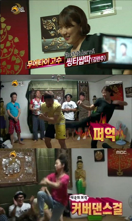 이날 방송에서 김란주 작가는 검은 옷을 입고 등장해 ‘무에타이’ 실력을 뽐냈다. 5명이 김란주 작가의 로우킥을 참아내면 빙수를 먹을 수 있는 미션이었다.