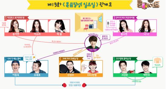 '룸메이트' 제작진은 지난 26일 공식홈페이지에 27일 방영될 제13화 '목표달성! 일요일'의 인물관계도를 공개했다.