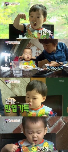 대한이는 입에 집어넣고 천천히 오물거렸고, 민국이는 탕수육의 맛을 음미하는 모습을 보였다. 막내 만세는 조그만 입에 탕수육을 한 입 가득 집어넣고 '정석 먹방'을 선보였다.