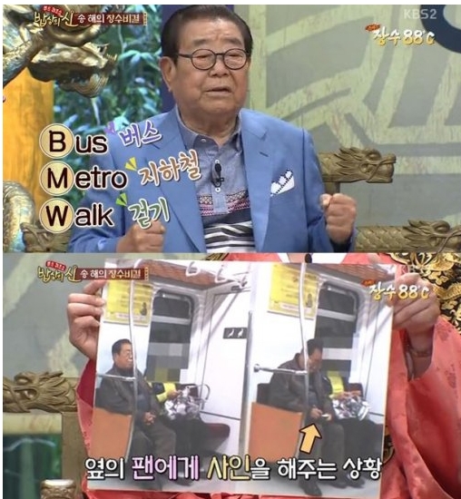 당시 방송에서 '지하철에서 졸고 있는 송해'라는 글과 사진이 인터넷에서 화제가 됐다. 송해는 그 사진이 졸고 있는 것이 아닌, 사인해주고 있는 사진이라고 해명해 큰 웃음을 줬다.