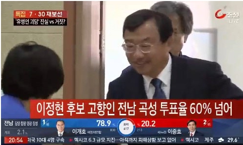 | ▲ 전남 순천 곡성 이정현 새누리당 후보 우세/사진=TV조선 방송화면 캡처 | ||
