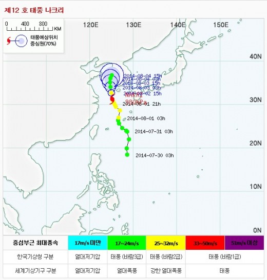 태풍 나크리는 2일 오전 9시 서귀포 남서쪽 약 210km부근 해상을 통과할 것으로 보이며 4일 오전에는 전북 군산 서쪽 부근 해상을 지날 것으로 예측된다.