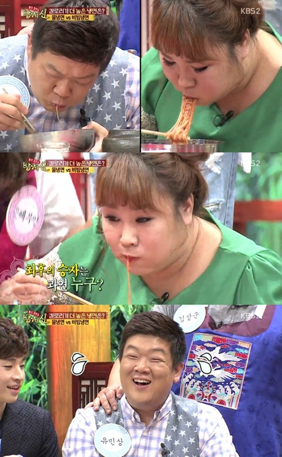 지난 7일 방송된 KBS2 예능프로그램 ‘밥상의 신’에는 김민경과 유민상이 냉면 빨리 먹기 대회를 벌이는 모습이 그려졌다.