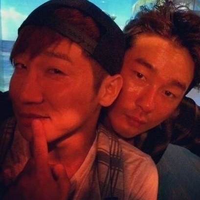 공개된 사진 속 허지웅은 특이한 포즈로 카메라를 응시하고 있는 유세윤을 뒤에서 끌어안고 있는 모습이다.