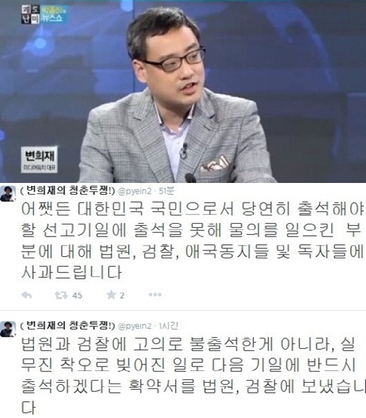 변희재는 "대한민국 국민으로서 당연히 출석해야 할 선고기일에 출석을 못해 물의를 일으킨 부분에 대해 법원, 검찰, 애국동지들 및 독자들에 사과드린다"고 말했다.