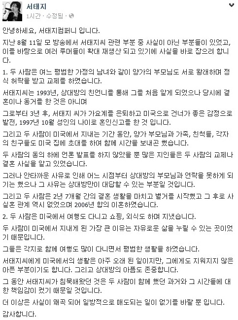 서태지컴퍼니는 "서태지씨에게 미국에서의 생활은 아주 오래 된 일이지만, 그에게도 지워지지 않은 아픈 부분이다. 그리고 상대방의 아픔도 존중한다"며 "그 동안 서태지씨가 침묵해왔던 것은 두 사람이 함께 했던 과거와 그 시간들에 대한 책임감이 컸기 때문이다 . 더 이상은 사실이 왜곡돼 일방적으로 매도되는 일이 없기를 바란다"고 마무리했다.