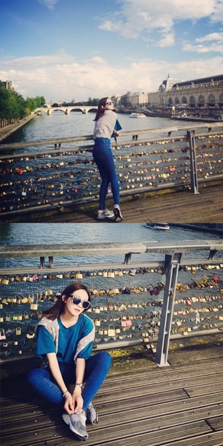공개된 사진 속 강민경은 파리의 명소인 ‘사랑의 자물쇠’ 다리 난간에서 포즈를 취하고 있다.
