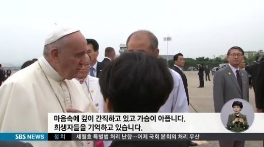 프란치스코 교황은 공항에서 세월호 유가족 보고 발길을 멈추고 인사했다. 교황은 유족들의 손을 일일이 맞잡고 "마음 속에 깊이 간직하고 있다. 가슴이 아프다. 희생자들을 기억하고 있다"고 위로했다.