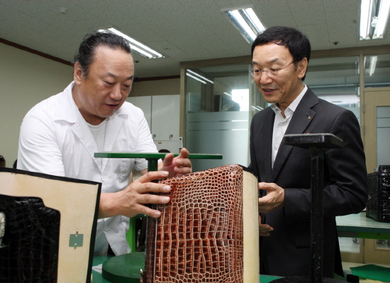 이건호 은행장은 20일엔 토종 브랜드 호미가로 알려진 악어가죽 핸드백 제조 중소업체 ㈜휘권양행을 방문해 현장경영을 실시했다.