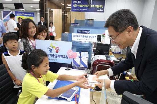 | ▲ 신한은행 김영표 부행장(오른쪽)과 초등학생들이 실제 영업점 체험을 하고 있다./신한은행 제공 | ||