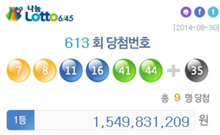 지난 30일 로또 613회 당첨번호를 추첨한 결과 ‘7, 8, 11, 14, 41, 44’, 번과 보너스 번호는 ‘35’로 결정됐다.