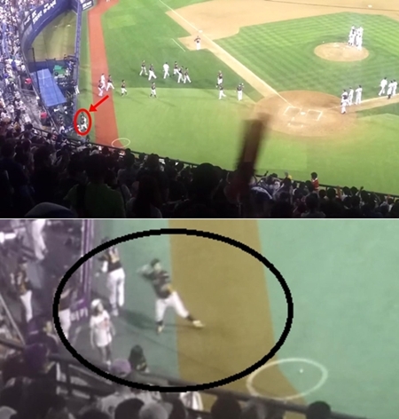동영상을 직접 촬영한 야구팬은 그 장면을 찍는 순간 “뭐야”라고 말하며 다소 놀란 목소리를 냈다.