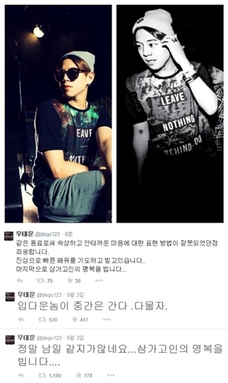우태운은 5일 자신의 트위터에 “같은 동료로서 속상하고 안타까운 마음에 대한 표현 방법이 잘못됐던 점 죄송합니다”는 글을 게재했다.